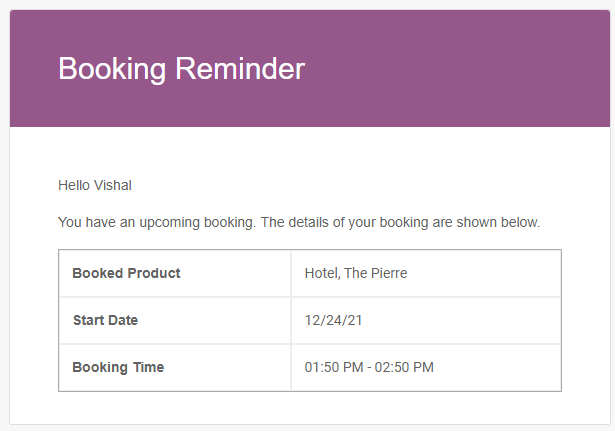 Let’s say a customer has made the booking for Hotel, The Pierre – 1:50 PM to 2:50 PM, then they will receive an automatic reminder email at 12:50 PM on 24th December as shown below: