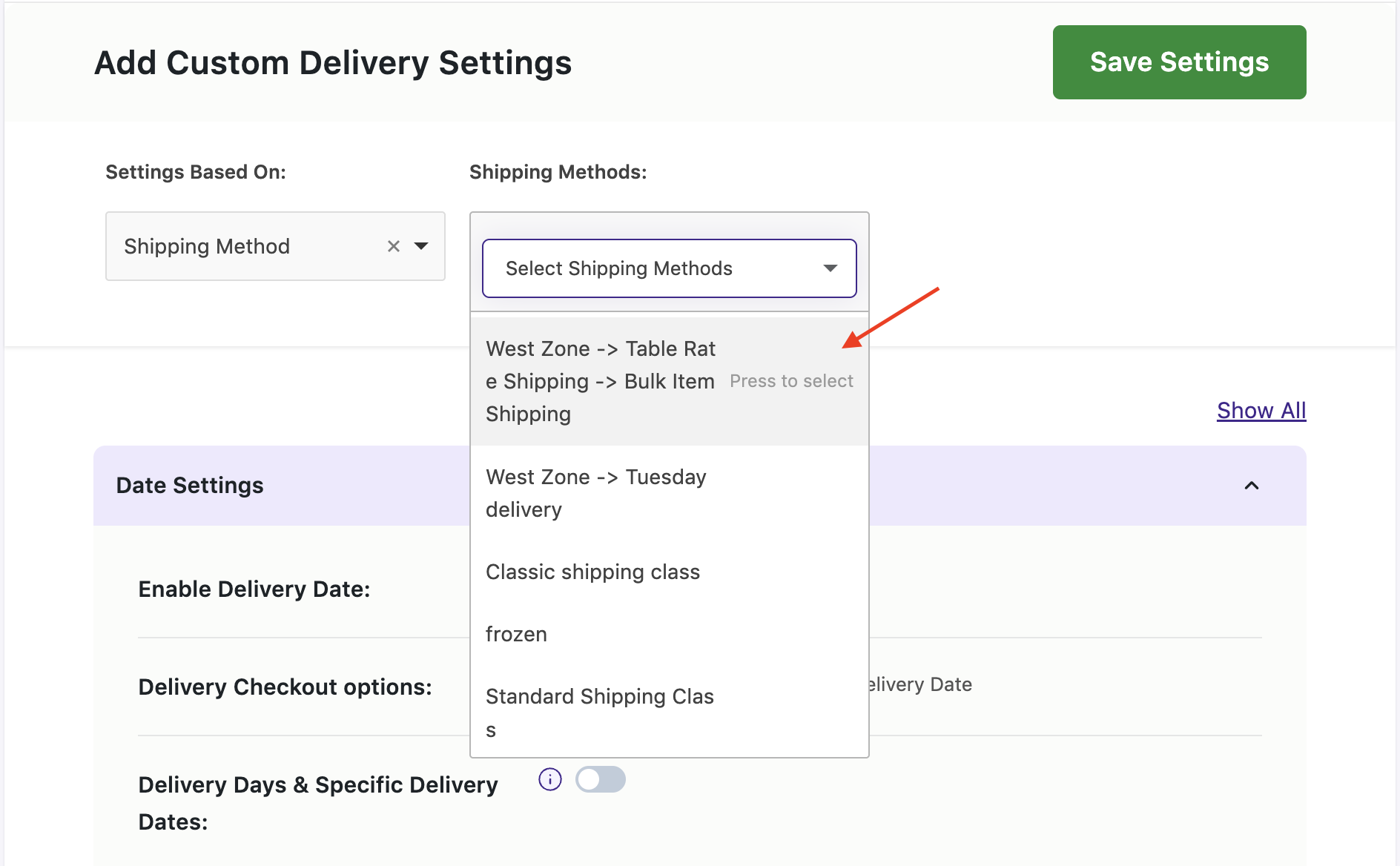 After selecting the shipping method, you can add delivery date & time settings for it. Once filled, it will appear like this: