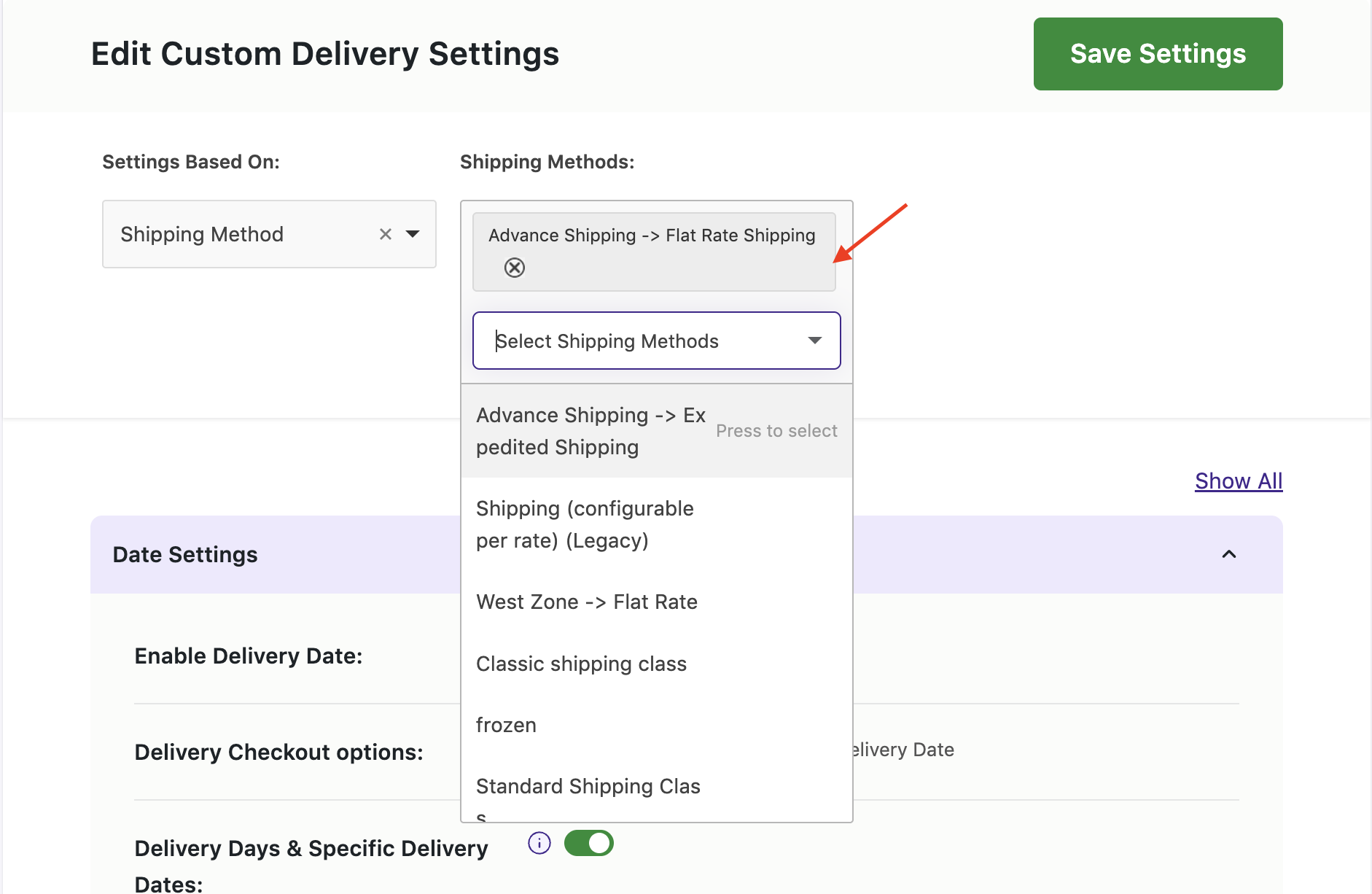 For instance, you can add delivery date & time settings for the selected shipping rate which is ‘Flat Rate Shipping’ as shown below: